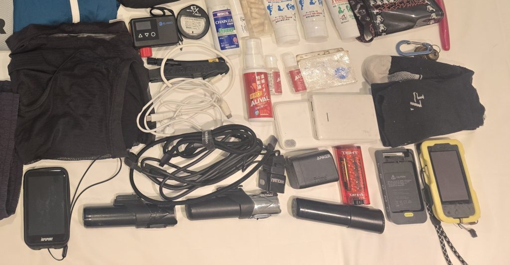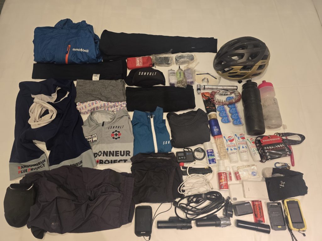ノンストップだから実現できる荷物量。止まらない分、スペースを取る防寒グッズは持参しない。万一の時は事前予測してコンビニ等で購入する。気温の低下次第で衣類、カッパ、手袋を購入する。今回は中部ステージの夜間に軍手を購入した。